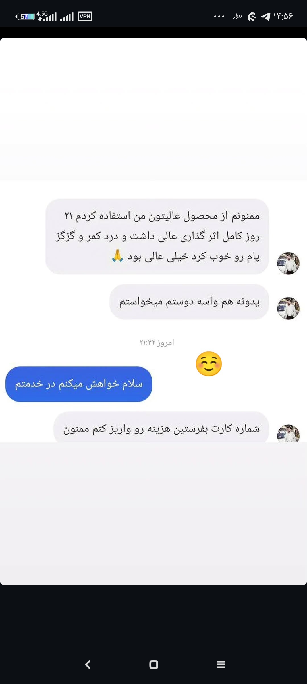 در روز اول استفاده درد به صورت کامل رفع میشه و طی فقط یک دوره مصرف کامل 21 روزه " درمان " برای شما انجام میشه ✅️